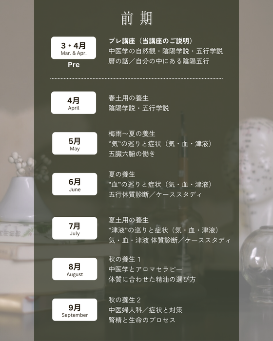 ※こちらのコースには「中医アロマセラピー(精油)」「季節の養生養生」「症例・ケーススタディー」の内容は含まれておりません。